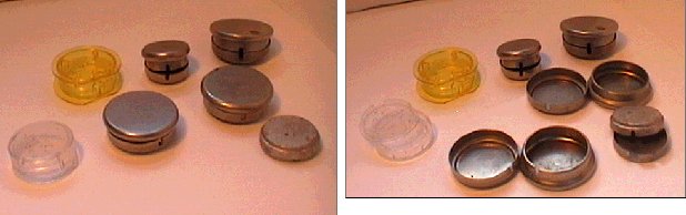 A selection of seven watch movement cases in various sizes. Five metal, two plastic, all lidded. Sizes vary from 20mm to 27mm diameter. All in good condition.