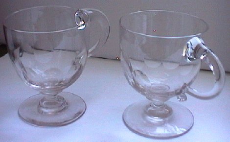 Two Victorian Custard Cups in very good condition. No damage to either. They measure 58mm diameter x 74mm tall. They have a thumb print pattern around the base of the cup. Hand made - slight difference in size of handles.