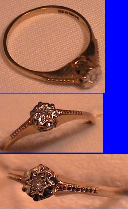 Diamond solitaire ring with nice clear 3 pt stone in a star setting supported by a figure-of-eight mounting. Pattern gold shoulders on either side of the diamond. The ring is 9 carat gold, English hallmark for 1985. The size is K (UK) or 5.5 (USA). A small size solitaire ring in good condition.