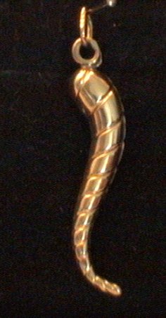 In excellent condition a 9 carat gold horn of life pendant. It weighs 1.5 grammes and measures 38mm long. Patterned all the way around.
