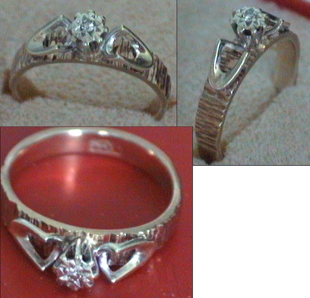 A 9 carat gold ring with a small diamond in a crown setting with two unusual stirrup shaped shoulders. The setting and stirrup are in a paler gold than the rest of the ring. The ring is size L (UK) or 6 (USA), and is stamped 9 carat. It weighs 3 grammes. A very attractive ring in good condition.