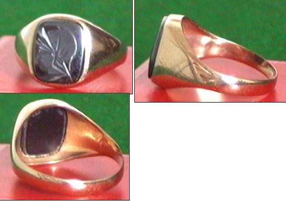 This 9 carat gold ring is size T (U.K) 10 (USA), the stone is approx 10mm diameter, clear engraving, good colour and the overall condition of the ring is very good.