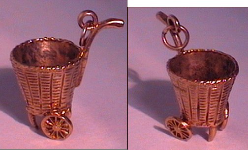 With a Birmingham hallmark for 1966 this 9 carat gold charm is in excellent condition. In the shape of a shopping trolley, it measures nearly 25mm tall and the basket is 13mm wide. The basket weave is very clear and the wheels move. A very collectable charm. Total weight 4 grammes.