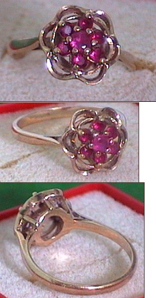 Nine carat gold ring with seven rubies in a claw setting in the centre of a two gold circles. The ring is size N (UK) or 7 (USA), the hallmark is Birmingham 1994. The condition is excellent, the rubies a good colour and the setting perfect. Total weight 2.5 grammes. The measurement of the setting is approx 11mm diameter.