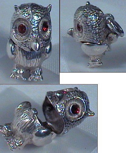 Owl silver charm, weighing 3.8 grammes and approx three-quarters inch long. He is hinged and opens in the centre and has two lovely red eyes. In very good condition.