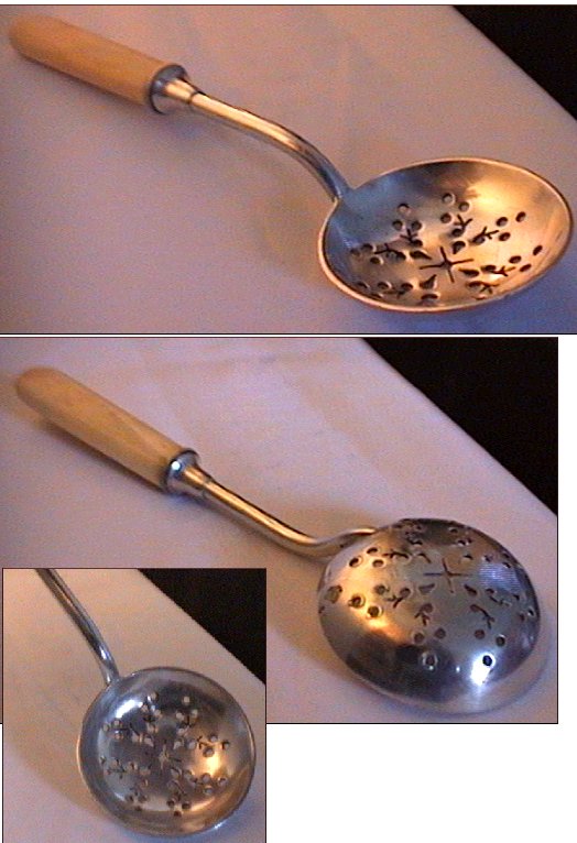 A silver plated strainer with bone handle. Approx 5.5 inches in length. Small patch of plating rubbed off on rear (shown in photo), otherwise in good condition.