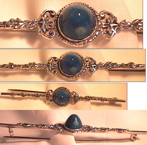 This is a very attractive pin produced at the beginning of the last century. It features a good size green\blue mottled domed stone in the centre and oak leaf pattern. Measures 3 inches in length.