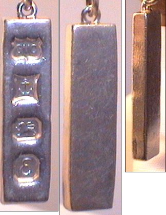 Silver ingot, hallmarked Birmingham 1979, weighing 8.5 grammes, and measuring 30mm x 6mm. In good condition.