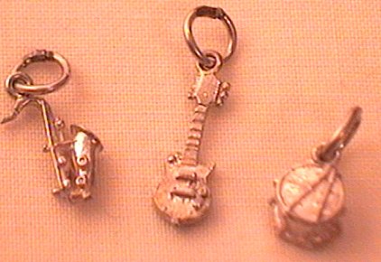 A selection of SMALL silver musical instruments. All in good condition and with good detail. Weighing in total 2 grammes and varying from quarter-inch to three-quarter inch in length. Guitar, drum and saxaphone.