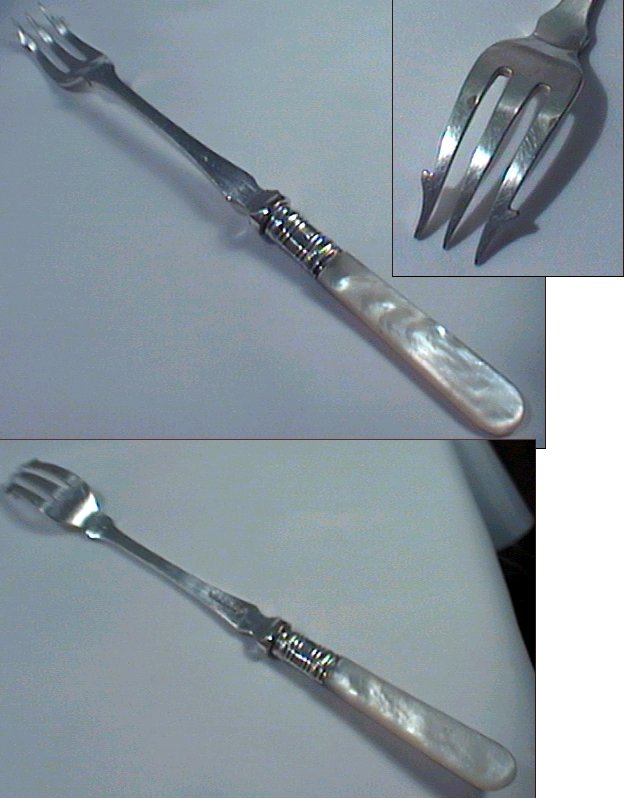 A silver plated pickle fork with mother of pearl handle. Measures 7 inches in length. Has two small wear marks on the back of the prongs but otherwise in very good condition.