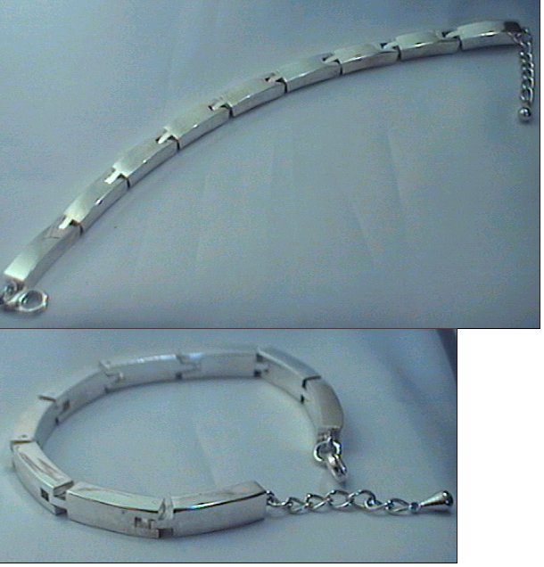 In excellent condition a rectangular link bracelet. Measures 8.5 inches to the end of the adjustable fastening chain. Links are 0.25 inches wide. Very attractive and sturdy bracelet.