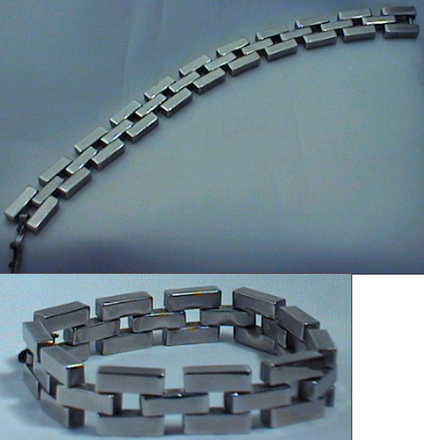Three row link bracelet measuring 7 inches in length and 0.5 inches wide. All links are secure. This is quite a heavy weight bracelet with a nice polished finish. It is in good condition.