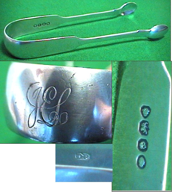 A pair of silver sugar tongs in very good condition, clearly hallmarked during 29th May and 20th June 1837 and embossed with the head of William. The makers mark of silversmith Daniel Peers is also visible. The initials BL are engraved on the top of the tongs. They measure 145mm in length.