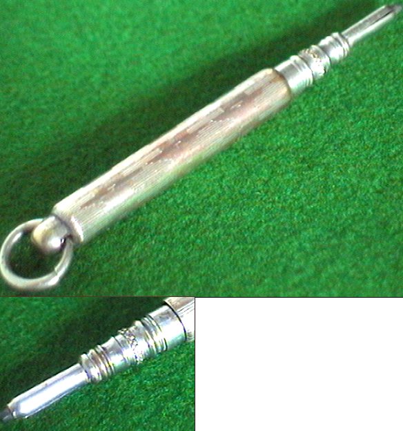 A small Victorian propelling pencil. Nicely decorated handle, with the word ENGLAND engraved along the top of the shaft. Measures 72mm long, including the ring at the base. Unfortunately, some small amount of silver has rubbed off, but the overall appearance is good.