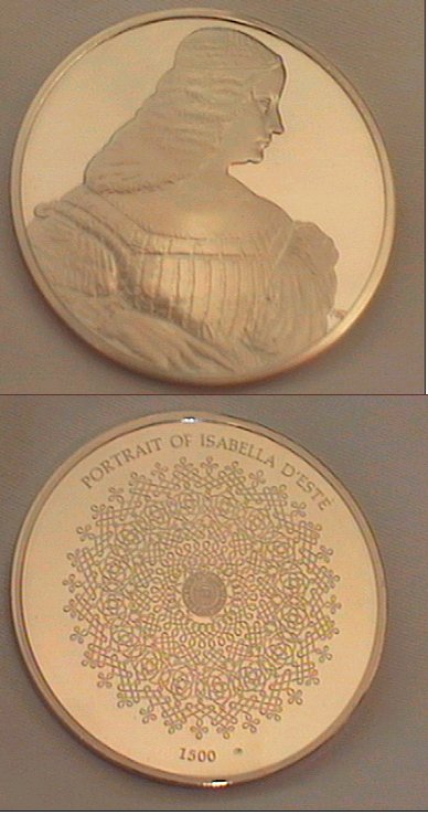 Issued in 1977, with a full English hallmark, to commerate the work of Leonardo da Vinci. It depicts da Vinci's portrait of Isabella D'Este painted in 1500. The medallion measures 50mm diameter, 4mm deep and weighs just over 50 grammes. Superb detail and in mint condition.