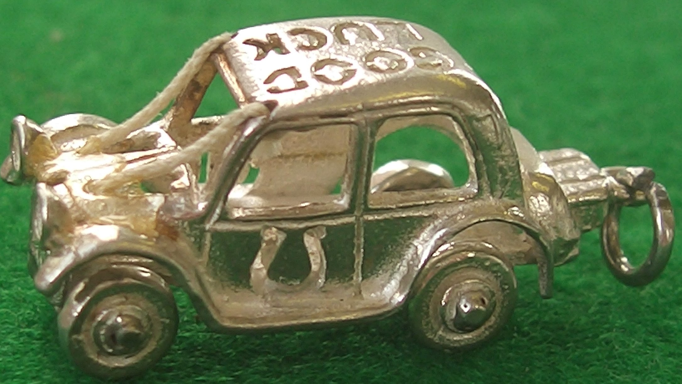 A lovely silver car with horseshoes engraved on the doors, white ribbon over the bonnet and 'good luck' marked on the roof.All four wheels turn and the car weighs just over 7 grammes. Measuring 28mm long x 13mm wide. In excellent condition.
