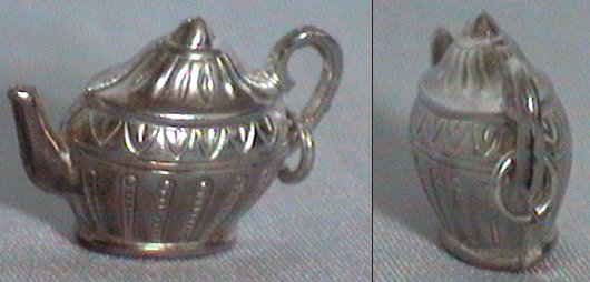 A decorative silver teapot with good shape and detail. Measures 16mm high x 24mm from spout to handle. Weight is 2 grammes. In excellent condition.