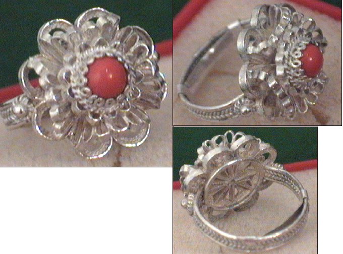 A silver ring in a pretty flower design with a coral centre. It is size G (UK) or 3.5 (USA). In very good condition. This ring matches a silver and coral bracelet presently on auction under "s213 - Silver and Coral Bracelet".