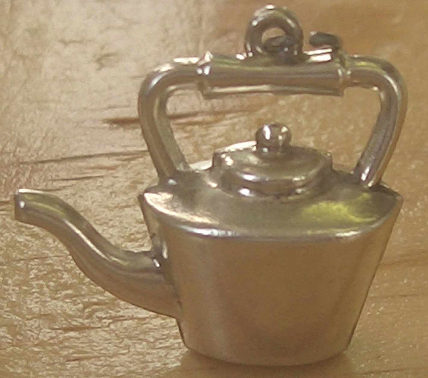 A big kitchen kettle in silver in good condition with no dents. Measures 25mm wide x 23mm tall and weighs 2.5 grammes.